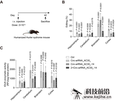 进一步地,研究人员尝试使用AAV递送的LEAPER 2.0来治疗人源化转录本中的提前终止密码子。提前终止密码子导致了11%的人类遗传病[5],因此针对此类密码子的编辑具有巨大的应用前景。为此研究者构建了人源化的Hurler综合征小鼠,该小鼠表达人源化的IDUA转录本,其中存在一个提前终止密码子,导致该小鼠可以模拟人类溶酶体贮积症,即粘多糖贮积症 I 型 (MPS-I)(图2A)。 MPS-I的特征是α-L-艾杜糖苷酶的酶活性缺陷,导致糖胺聚糖 (GAG)的积累。通过筛选和理性设计,研究者成功地提高了ADAR编辑的精确性,并获得了高效的工程化circ-arRNA。使用AAV-PHP.eB递送circ-arRNA到小鼠体内,不仅在肝脏等器官,而且在神经系统恢复了α-L-艾杜糖苷酶的酶活性(图2B,C),降低了GAG的积累,显著改善了小鼠的表型。由于目前MPS-I的治疗策略多为酶替代疗法,递送的IDUA蛋白不能跨越血脑屏障,因此无法治疗中枢神经系统中的GAG积累[6],而LEAPER 2.0介导的RNA编辑能够在多个器官中恢复细胞内源IDUA转录本的功能,从而实现了更优的治疗效果。