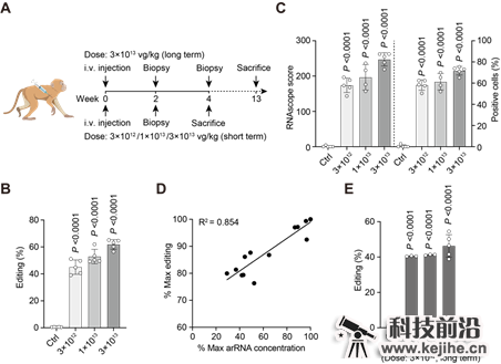 首先,研究人员在非人灵长类动物的体外培养细胞内进行了实验,通过优化获得了高效且精准的工程化circ-arRNA,其靶向位点的编辑效率可高达47%。随后,他们将该工程化circ-arRNA包装到AAV病毒中,成功实现了在非人灵长类动物体内的递送。然而,临床上使用的AAV剂量一旦超过1 × 1014 vg/kg,会带来严重毒性[4],因此该研究将AAV剂量控制在临床可接受的范围内,分别为3×1012,1×1013和3×1013 vg/kg的剂量 (图1A)。将这三种剂量的肝靶向AAV8注射到非人灵长类动物体内,并进行长期观察和检测,结果显示在第二周,肝脏细胞编辑效率可达50%以上(图1B)。通过计算感染效率(图1C)发现受AAV感染的肝脏细胞编辑效率可高达80%,这表明LEAPER 2.0可以在体内快速且高效地发挥作用。此外,研究人员还发现,编辑效率呈剂量依赖性,随着AAV8剂量的升高,非人灵长类动物体内工程化circ-arRNA的表达量增加,从而提高了编辑效率,这表明LEAPER 2.0具有良好的药物剂量依赖性 (图1D)。编辑效率在非人灵长类动物体内可以维持13周并保持稳定,说明通过AAV递送的LEAPER 2.0具有长期编辑的特点(图1E)。此外,研究者未观察到LEAPER 对非人灵长类动物具有毒性,表明该编辑技术是安全且特异的。