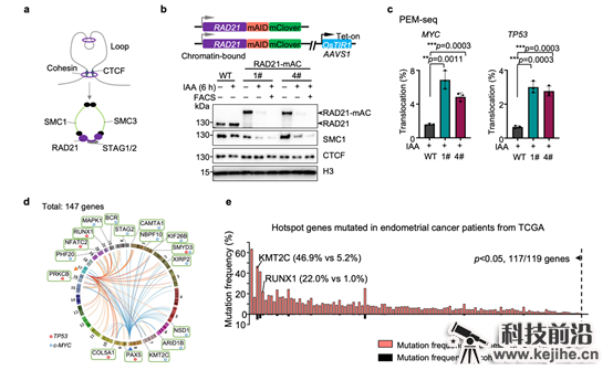 (a)染色质loop及 Cohesin复合体示意图。(b)K562细胞中RAD21 AID蛋白降解体系构建与验证。1#和4#为构建成功的RAD21-mAID-mClover细胞系,简称RAD21-mAC。(c)PEM-seq方法从MYC和TP53位点分别检测RAD21降解后染色体易位频率。(d)RAD21降解导致的DSB热点基因。(e)TCGA数据库子宫内膜癌样本中热点基因与Cohesin蛋白亚基共突变情况。