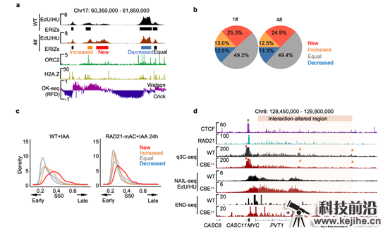 (a)RAD21降解后(4#)NAIL-seq检测到的早期复制起始信号(EdU/HU)和所鉴定的早期复制起始位点(Early replication initiation zones, ERIZs)。 (b)饼图统计1#和4#RAD21-mAC细胞中RAD21降解后ERIZ信号强度分类和比例。(c)K562中四类ERIZ区域在RAD21未降解和降解的细胞中所处的复制时序密度图。(d)c-MYC区域染色质环锚定位点的敲除(绿色方块)造成橙色阴影区域染色质相互作用(q3C-seq)减弱,早期复制起始信号(NAIL-seq)增强和DSB(END-seq)的增加。