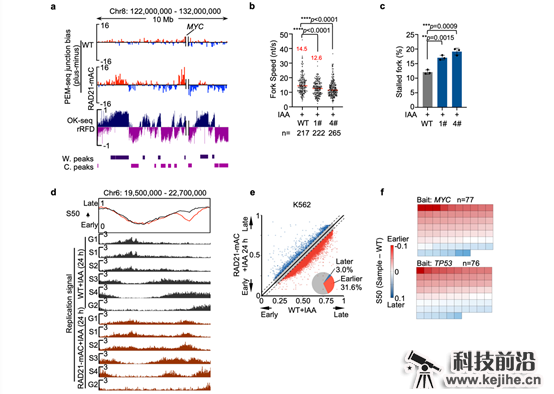 (a)PEM-seq检测RAD21降解后细胞中染色体易位断裂位点偏向性与OK-seq相似。(b)RAD21降解导致复制叉速率减慢。(c)RAD21降解导致复制叉停顿增加。(d)RAD21降解导致部分基因组区域复制时序提前。(e)K562细胞基因组中31.6%的区域在RAD21降解后发生复制时序的显著提前。(f)热点基因的复制时序变化情况,每个方格表示一个基因,红色和蓝色分别表示复制时序的提早和延迟。