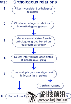 为精准鉴定基因丢失事件,高歌团队提出了新的基因丢失鉴定方法LOST & FOUND。LOST & FOUND的具体处理流程如图1所示。LOST & FOUND结合了全基因组比对以及多物种中的直系同源基因数据,并运用最大简约法等处理方法来对基因丢失进行鉴定识别。基于多物种直系同源基因关系的推断可使LOST & FOUND避免将参考物种中的基因获得事件错误识别为待研究物种中的基因丢失事件。而全基因组比对的使用则可充分考虑基因及其上下游区段的同源性,有利于LOST & FOUND识别由大片段删除等方式造成的基因丢失事件。