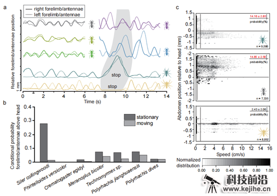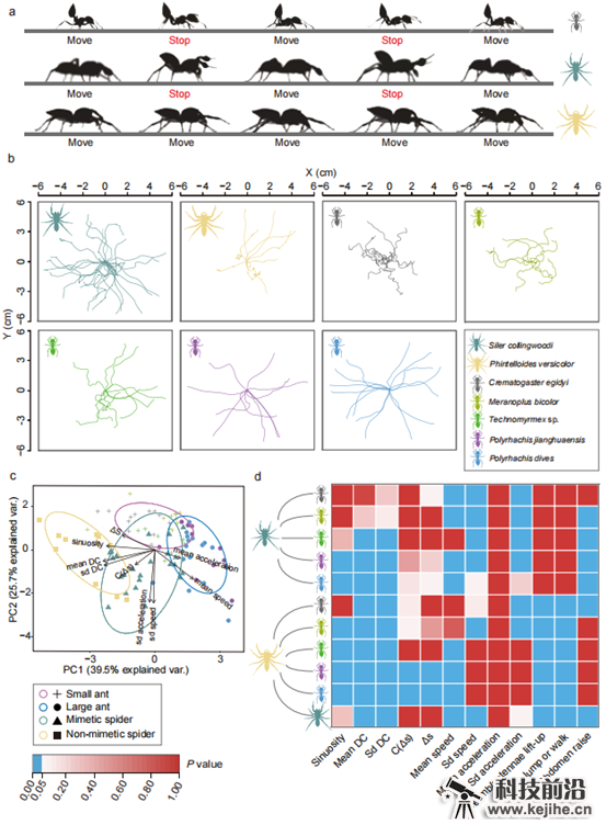 图3. 科氏翠蛛及同域分布的蚂蚁、非拟态跳蛛的步态分析