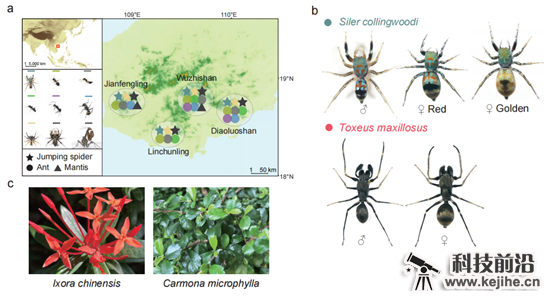 2023年5月17日,北京大学生命科学学院、蛋白质与植物基因研究国家重点实验室、北大-清华生命科学联合中心张蔚课题组,在iScience上发表了题为“Imperfect ant mimicry contributes to local adaptation in a jumping spider”的研究论文。该研究聚焦体色艳丽的跳蛛科翠蛛属科氏翠蛛(Siler collingwoodi),通过对其与同域分布的跳蛛及蚂蚁的运动及体色特征进行定量检测分析(图1),证明了科氏翠蛛存在不完美的蚂蚁拟态;行为学实验结果揭示了科氏翠蛛的不完美拟态对其适应环境的重要意义。